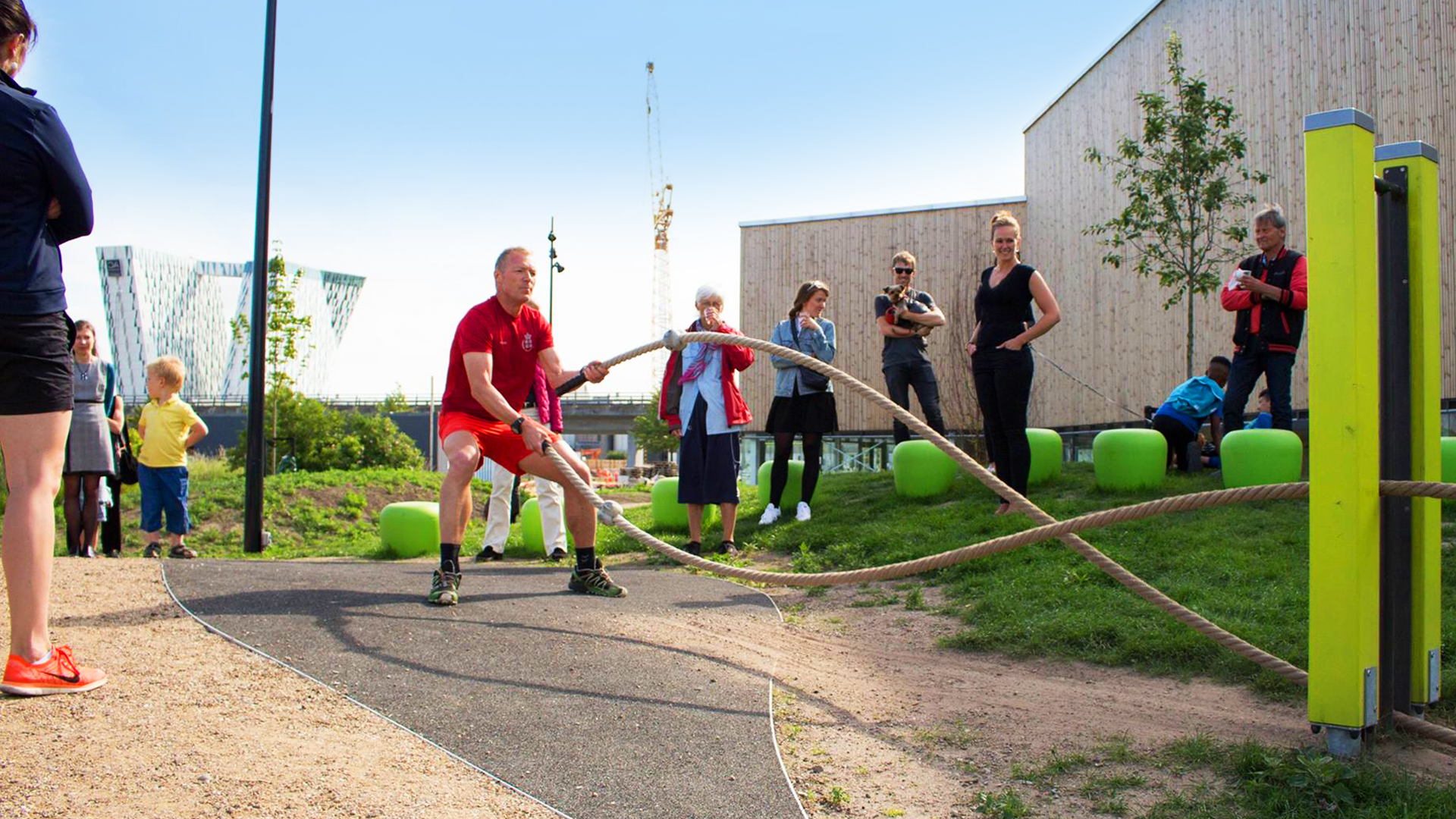 Fitnessparken er udviklet i samarbejde med en professionel træningskonsulent, og er opdelt i mange forskellige stationer. Du kan prøve kræfter med push-up bars, crossfit-yndlingen: battling ropes, eller et stort anlæg til træning med egen kropsvægt. Børnene vil også elske den grønne trædestensbane hvor man kan lege jorden er giftig i timevis. En fantastisk bane som både er god til at træne balance og grovmotorik. I alt rummer parken lidt over ti forskellige træningszoner, med noget for enhver smag. Er du mere til løbetræning, kan du følge den bugtede løbesti rundt om hallen.