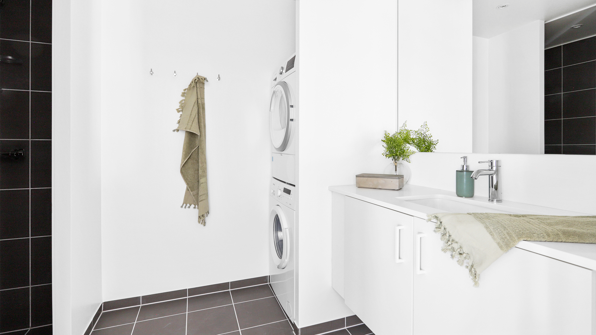På badeværelset er det de grå og sorte klinker der igen skaber den flotte kontrast til de stilrene, hvide vægge. Der er god plads på badeværelset, også til den praktiske, indbyggede vaskesøjle.
