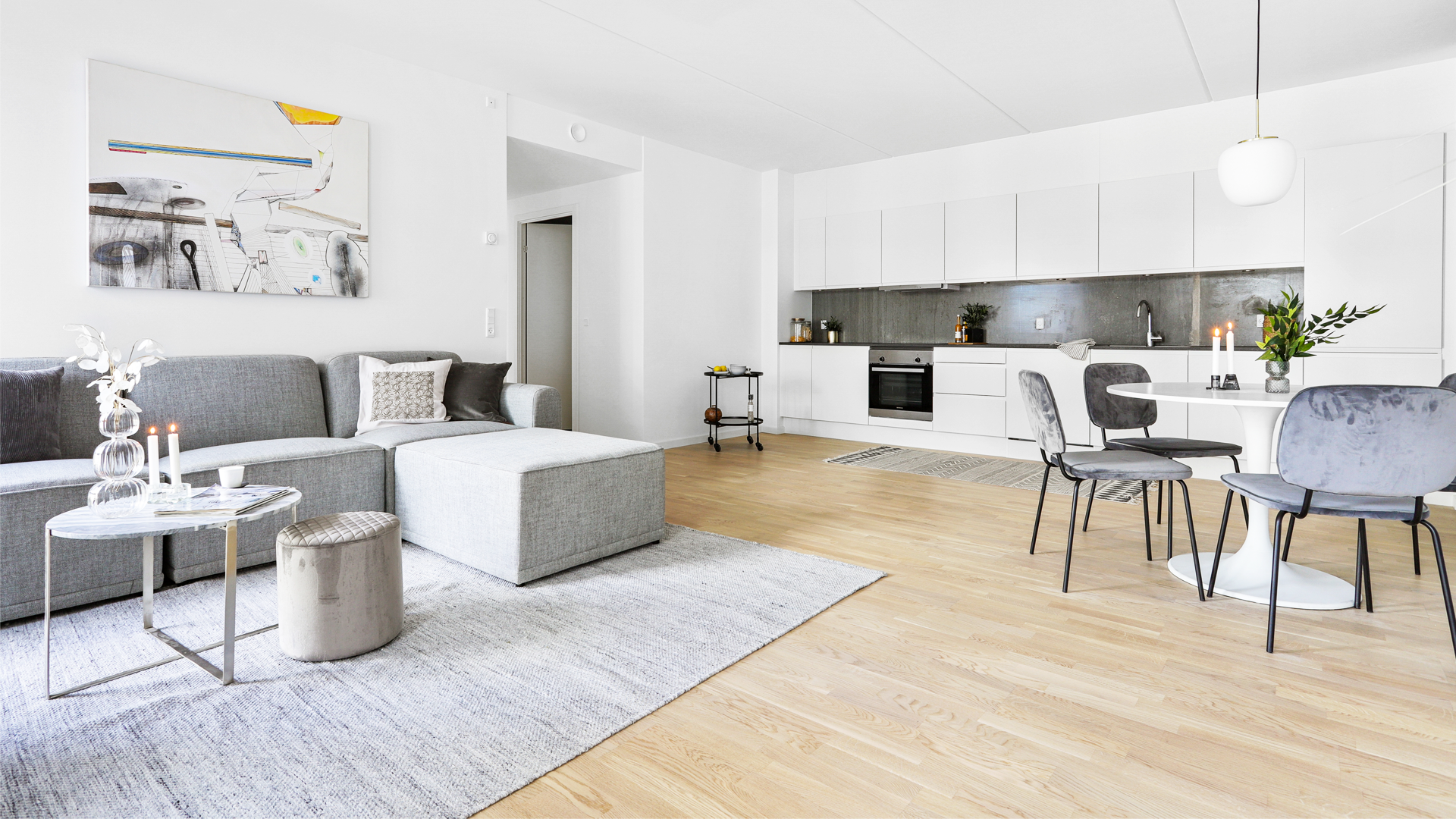 Kronehaverne består af 2-, 3- og 4-værelses lejligheder i størrelser fra 53-129 m2. Både singler og familier der vil nyde godt af den bynære beliggenhed og det fredede naturområde, kan finde en bolig der passer lige ind i deres behov. Her får man en nybygget, Svanemærket lejlighed som er lige til at flytte ind i. De store, åbne rum, er holdt i hvide farver, med et moderne, hvidt Designa køkken og flotte egeparket trægulve. En lækker detalje, er de sorte vinduesrammer som bryder med det hvide look, og skaber en anderledes og elegant kontrast.