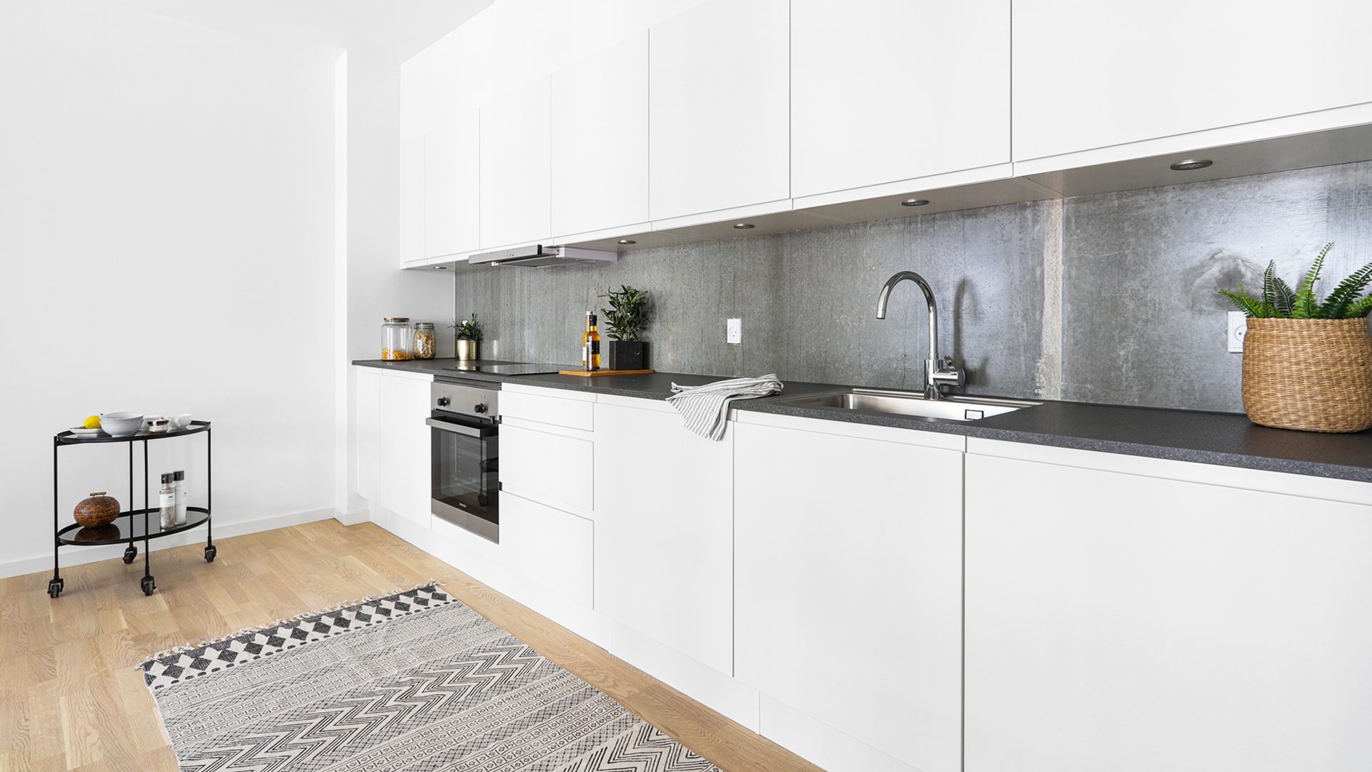 Det er arkitekterne fra COBE der har sørget for at de indvendige rammer, matcher Kronehavernes cool og stilrene ydre. En ekstra fed detalje er de helt rå betonvægge, som på forskellige steder i lejlighederne, giver et urbant modspil til de hvide vægge. Den rå, industrielle beton fremhæver lejlighedernes moderne storbyvibe, som passer godt til beliggenheden tæt på København.